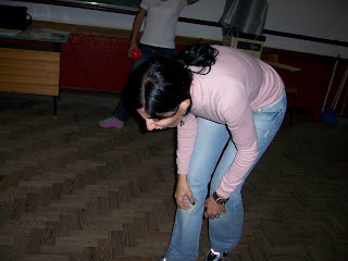 A fim de relaxar e aquecer começamos por formar uma roda e iniciamos o aquecimento, fazendo vários movimentos, mexendo cada parte do corpo (pescoço, cintura, braços, mãos…), saltando, deixando cair os braços, levando o corpo para um lado e para o outro.